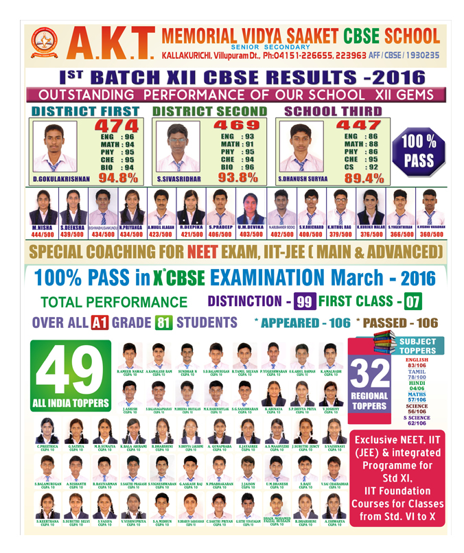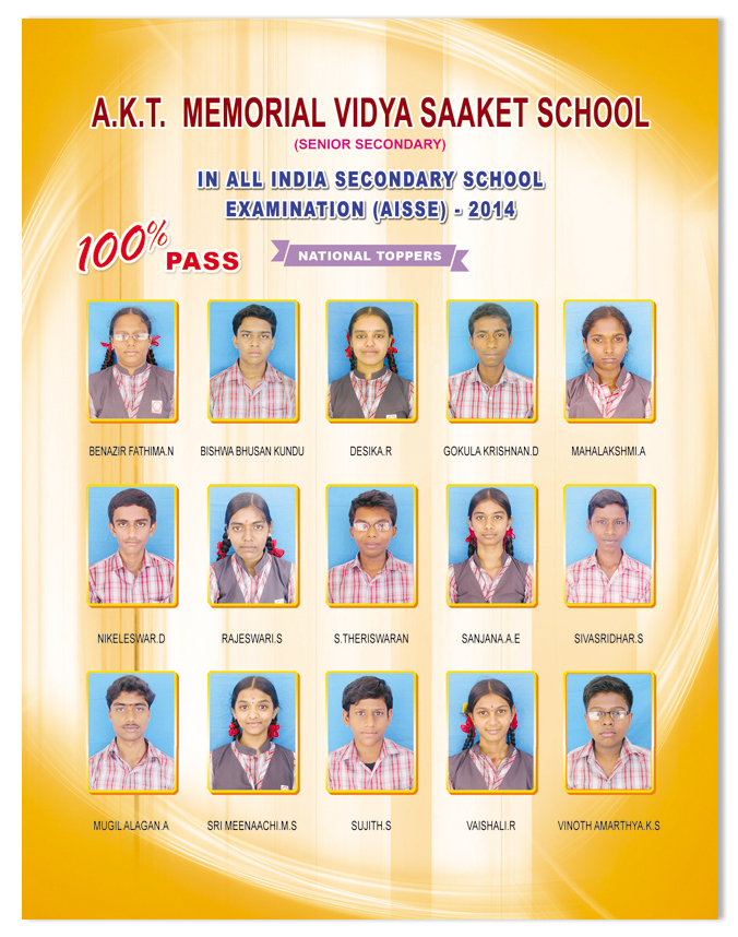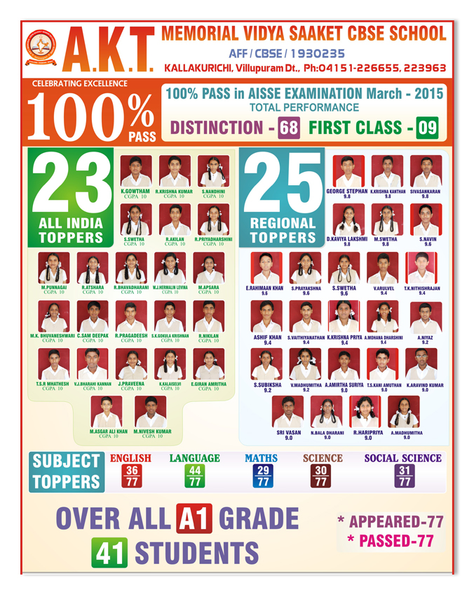 All All the students at AKT VIDYA SAAKET have consistently secured excellent results in the All India Senior School Certificate Examinations (AISSCE) and All India Secondary School Examinations (AISSE).